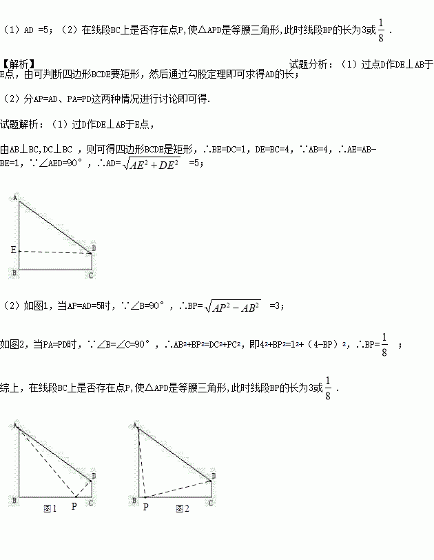 (2) 在线段BC上是否存在点P,使△APD是等腰三角形,若存在,求出线段BP的长;若不存在,请说明理由.