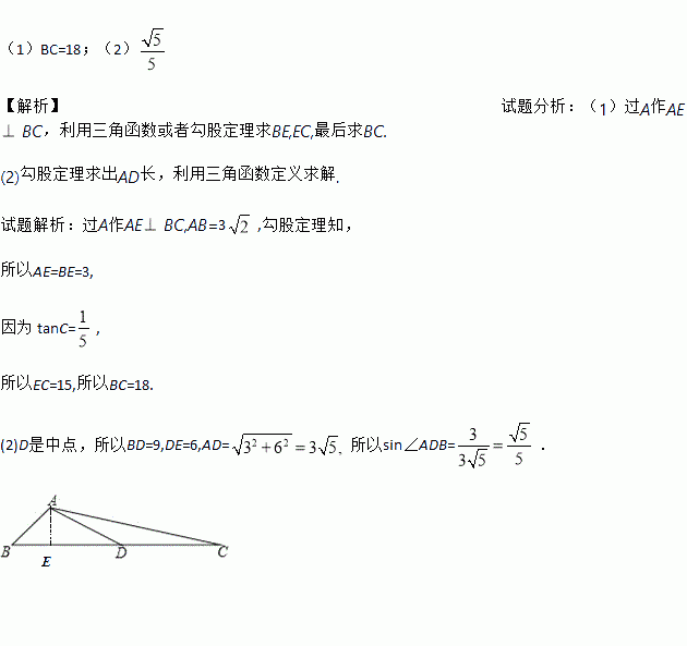 如图,△ABC中,∠B=45°,AB=3,D是BC中点,tanC=.