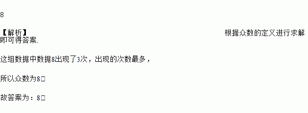 在创建“平安校园”活动中,郴州市某中学组织学生干部在校门口值日,其中八位同学3月份值日的次数分别是:5,8,7,7,8,6,8,9,则这组数据的众数是_____.