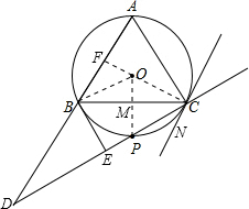 分析:①过C作圆O的切线CN,CN∥AB,理由为:连接OP,OC并延长交AB于点F,连接OB,由P为弧BC的中点,利用垂径定理的逆定理得到OP垂直于BC,M为BC的中点,利用同弧所对的圆心角等于所对圆周角的2倍,求出∠BOC的度数,进而确定出∠BCF的度数,由CN为圆O的切线,利用切线的性质得到∠OCN为直角,求出∠BCN=∠ABC=60°,利用内错角相等两直线平行即可得证;
