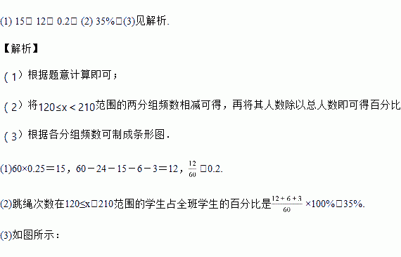 (2)跳绳次数在120≤x<210范围的学生占全班学生的百分比是多少?