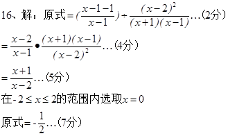 (本小题满分7分)先化简,然后从的范围内选取一个合适的整数作为的值代入求值.