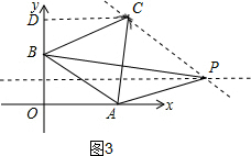 (4)过点C作AB的平行线,过BO的中点作x轴的平行线,两线交于点P,由同底等高的三角形面积可得S△ABP=S△ABC,作CD⊥y轴,BC=AB=2,∠OBA=60°,∠CBA=60°,可得∠CBD=60°,利用特殊直角三角形得CD=$\sqrt{3}$,BD=1,从而得出C的坐标,设直线CP的解析式为y=-$\frac{\sqrt{3}}{3}$x+b,把C($\sqrt{3}$,2)代入得b的值,从而得出直线CP的解析式,把y=$\frac{1}{2}$代入得x的值即可得出点P的坐标.