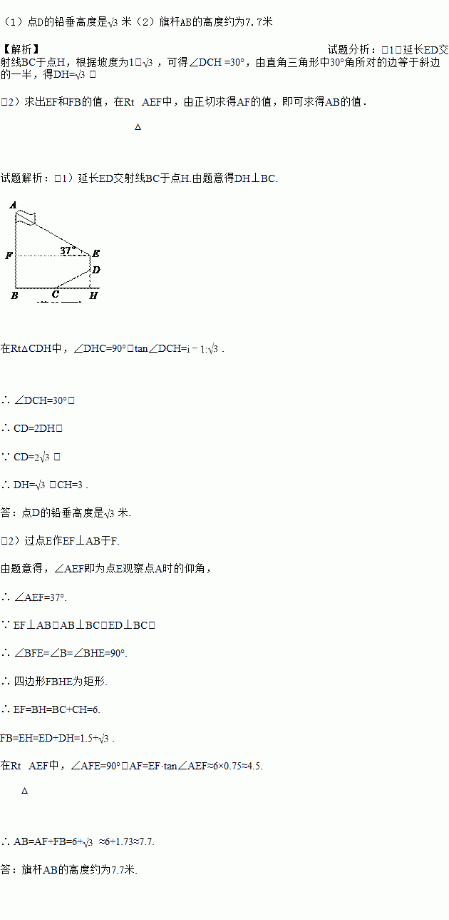 米到达点D,在点D处放置测角仪,测得旗杆顶部A的仰角为37°,量得测角仪DE的高为1.5米.A、B、C、D、E在同一平面内,且旗杆和测角仪都与地面垂直.