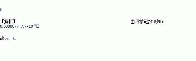 A. 77×10﹣5 B. 0.77×10﹣7 C. 7.7×10﹣6 D. 7.7×10﹣7