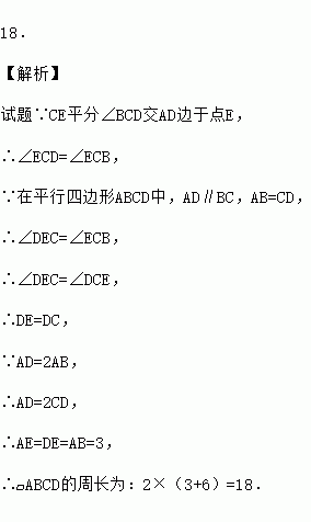 如图,在?ABCD中,AD=2AB,CE平分∠BCD交AD边于点E,且AE=3,则?ABCD的周长为 .
