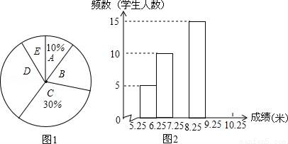 将九年级部分男生掷实心球的成绩进行整理,分成5个小组(x表示成绩,单位:米).A组:5.25≤x<6.25;B组:6.25≤x<7.25;C组:7.25≤x<8.25;D组:8.25≤x<9.25;E组:9.25≤x<10.25,并绘制出扇形统计图和频数分布直方图(不完整).规定x≥6.25为合格,x≥9.25为优秀.