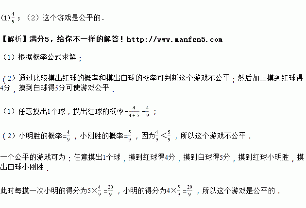 个球,摸到红球小明胜,摸出白球小刚胜,这个游戏公平吗?如果不公平,请你在此基础上设计一个公平的游戏,并说明你的设计理由.![]()