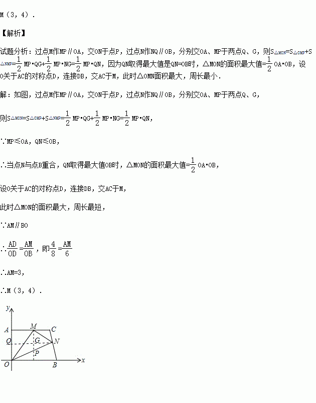 在平面直角坐标系中,直角梯形AOBC的位置图所示,∠OAC=90°,AC∥OB,OA=4,AC=5,OB=6.M、N分别在线段AC、线段BC上运动,当△MON的面积达到最大时,存在一种使得△MON周长最小的情况,则此时点M的坐标为 .