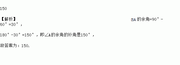 若∠A=60°,则∠A 的余角的补角是________度.