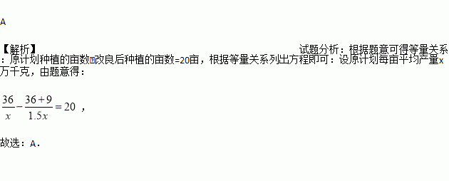 遂宁市某生态示范园,计划种植一批核桃,原计划总产量达36万千克,为了满足市场需求,现决定改良核桃品种,改良后平均每亩产量是原计划的1.5倍,总产量比原计划增加了9万千克,种植亩数减少了20亩,则原计划和改良后平均每亩产量各是多少万千克?设原计划每亩平均产量为x万千克,则改良后平均每亩产量为1.5x万千克,根据题意列方程为( )