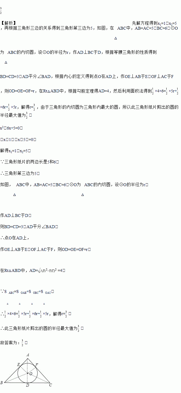 已知一个三角形纸片的两边长是5和6,第三边的长是方程x2﹣6x+5=0的一个根,若用此三角形纸片剪出一个圆,则剪出的圆的半径最大是_____.