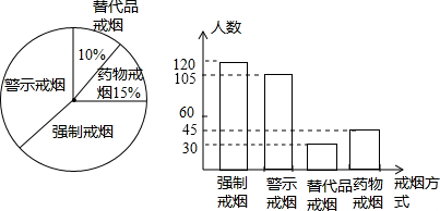 (2)由题意得:“药物戒烟”的人数为300×15%=45(人),“警示戒烟”的人数为300-120-30-45=105(人),