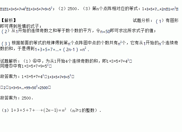 (1)1+3+5+7=42,1+3+5+7+9=52;(2)2500.(3)第n个点阵相对应的等式:1+3+5+7…+2n﹣1=n2. 【解析】试题分析:(1)有图形即可得到所填的式子; (2)从1开始的连续奇数之和等于数个数的平方,令n=50即可求出所求式子的值; (3)根据前面的等式的规律得到第n个点阵图中点的个数共有n2个,它有从1开始的n个连续奇数的和,于是得到1+3+5+7...