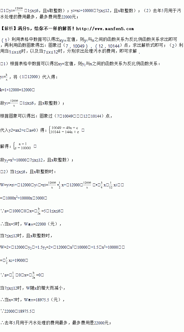 7至12月,该企业自身处理的污水量y2(吨)与月份x(7≤x≤12,且x取整数)之间满足二次函数关系式为y2=ax2+c(a≠0).其图象如图所示.1至6月,污水厂处理每吨污水的费用:z1(元)与月份x之间满足函数关系式:z1=