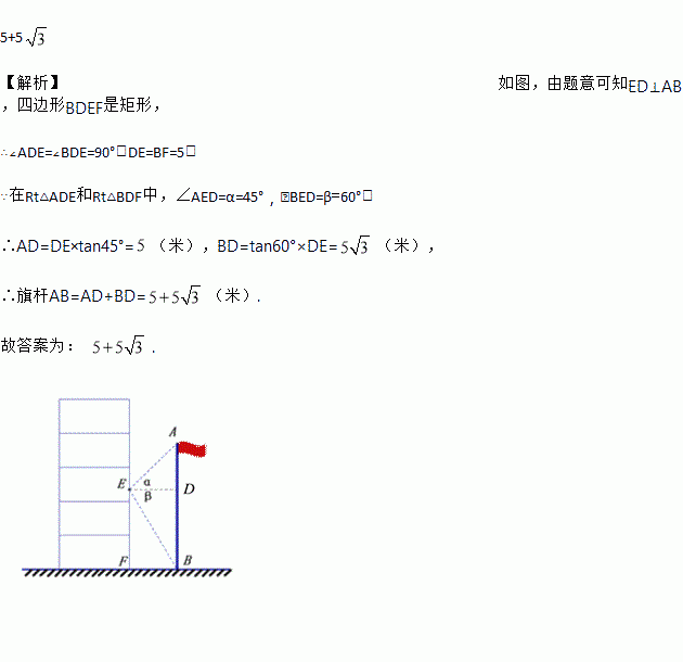 Êýѧʵ¼ù¿ÎÉÏ£¬Í¬Ñ§ÃÇ·Ö×é²âÁ¿½Ìѧ¥ǰ¹úÆì¸ËµÄ¸ß¶È.СÔóͬѧËùÔÚµÄ×éÏÈÉè¼ÆÁ˲âÁ¿·½°¸£¬È»ºó¿ªÊ¼²âÁ¿ÁË.ËûÃÇÈ«×é·Ö³ÉÁ½¸ö²âÁ¿¶Ó£¬·Ö±ð¸ºÔðÊÒÄÚ²âÁ¿ºÍÊÒÍâ²âÁ¿£¨Èçͼ£©.ÊÒÄÚ²âÁ¿×éÀ´µ½½ÌÊÒÄÚ´°Ì¨ÅÔ£¬ÔÚµãE´¦²âµÃÆì¸Ë¶¥²¿AµÄÑö½Ç¦ÁΪ45¡ã£¬Æì¸Ëµ×²¿BµÄ¸©½Ç¦ÂΪ60¡ã. ÊÒÍâ²âÁ¿×é²âµÃBFµÄ³¤¶ÈΪ5Ã×.ÔòÆì¸ËAB=______Ã×.