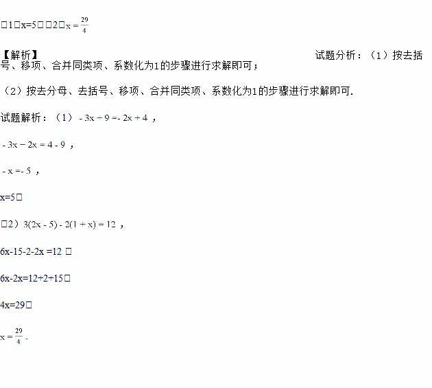 解方程: (1) -3x + 9 = 2(-x + 2);(2)