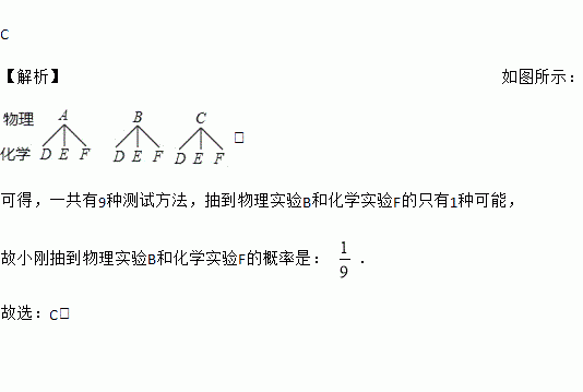 我市今年中考理、化实验操作考试,采用学生抽签方式决定自己的考试内容,规定:每一位考生必须在三个物理实验(用纸签A、B、C表示)和三个化学实验(用纸签D、E、F表示)中各抽取一个进行考试,小刚在看不到纸签的情况下,分别从中各随机抽取一个.小刚抽到物理实验B和化学实验F的概率是( )