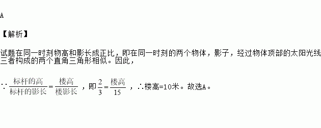 小明在测量楼高时,先测出楼房落在地面上的影长BA为15米(如图),然后在A处树立一根高2米的标杆,测得标杆的影长AC为3米,则楼高为