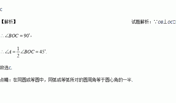 如图,△ABC内接于⊙O,且OB⊥OC,则∠A的度数是( )