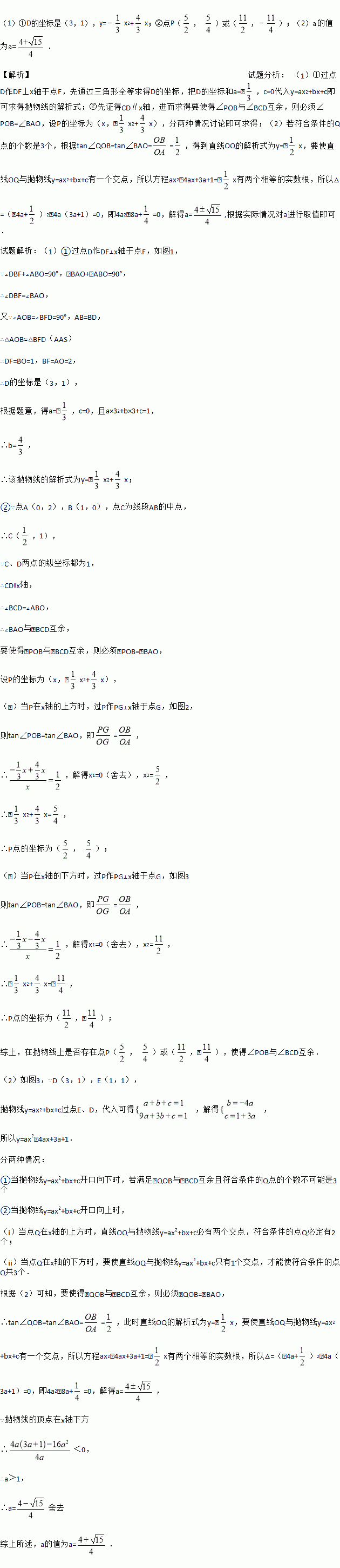 (1)①D的坐标是(3,1),y=﹣x2+x;②点P(, )或(,﹣);(2)a的值为a=. 【解析】试题分析: (1)①过点D作DF⊥x轴于点F,先通过三角形全等求得D的坐标,把D的坐标和a=﹣,c=0代入y=ax2+bx+c即可求得抛物线的解析式;②先证得CD∥x轴,进而求得要使得∠POB与∠BCD互余,则必须∠POB=∠BAO,设P的坐标为(x,﹣x2+x),分两种情况讨论即可求得;(...