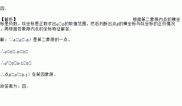 四. 【解析】根据第二象限内点的横坐标是负数,纵坐标是正数求出a、b的取值范围,然后判断出点B的横坐标与纵坐标的正负情况,再根据各象限内点的坐标特征解答. 【解析】 ∵A(a,-b)是第二象限的一点, ∴a<0,-b>0, ∴a2>0,b-1<0, ∴点B(a2,b-1)在第四象限. 故答案为:四.