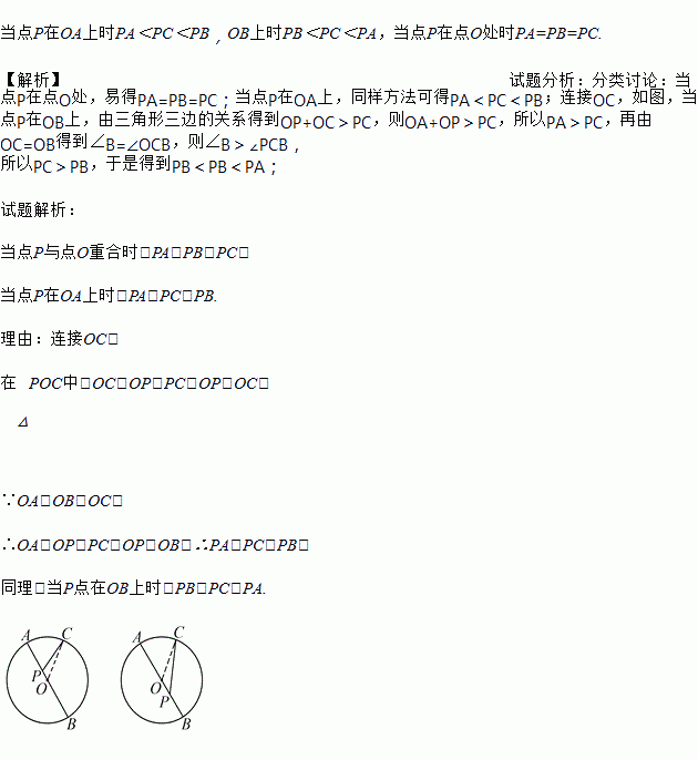 如图所示,在⊙O上有一点C(C不与A、B重合),在直径AB上有一个动点P(P不与A、B重合).试判断PA、PC、PB的大小关系,并说明理由.