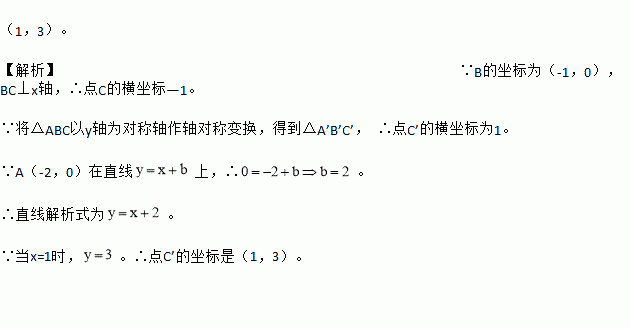 如图,在平面直角坐标系中,△ABC的两个顶点A,B的坐标分别为(-2,0),(-1,0),BC⊥x轴,将△ABC以y轴为对称轴作轴对称变换,得到△A’B’C’(A和A’,B和B’,C和C’分别是对应顶点),直线