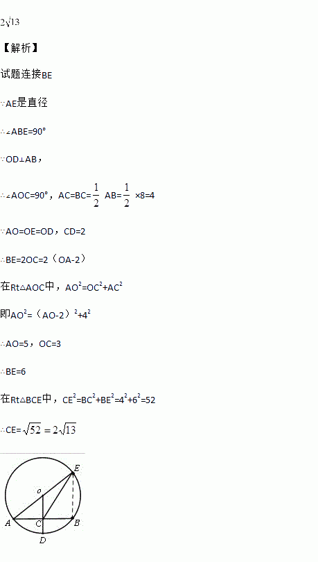 如图,⊙O的半径OD垂直于弦AB,垂足为点C,连接AO并延长交⊙O于点E,连接EC.若AB=8,CD=2,则EC的长为________.