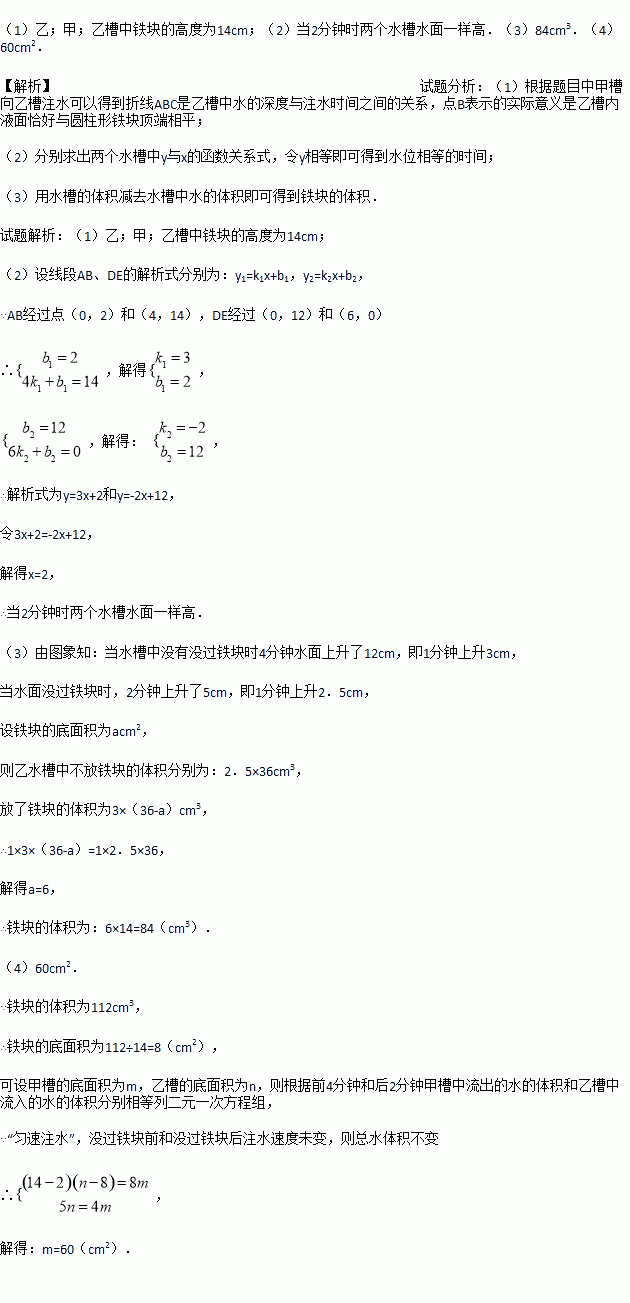 (3)若乙槽底面积为36平方厘米(壁厚不计),求乙槽中铁块的体积;
