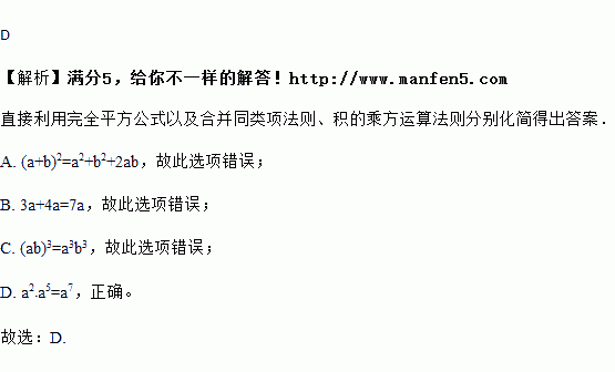 A. (a+b)2=a2+b2 B. 3a+4a=7a2
