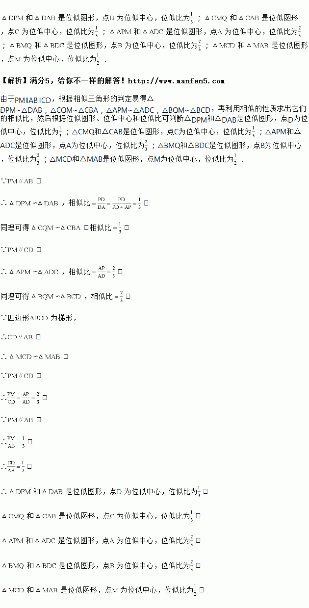 过梯形对角线的交点,作底的平行线分别交两腰于和,,求:图中的位似图形,并分别指出位似中心和位似比.