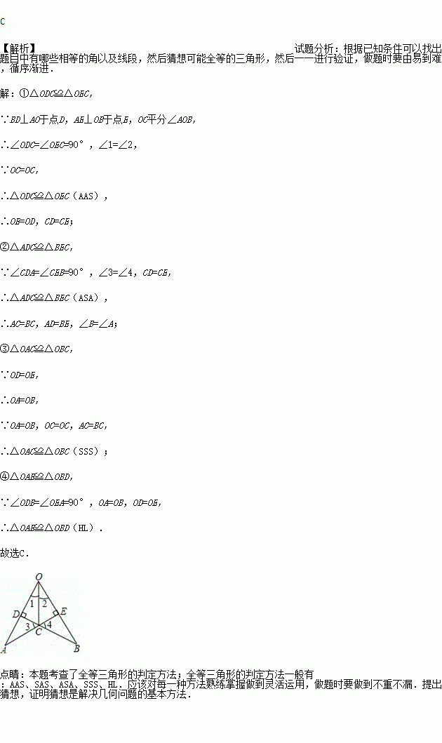 如图所示,∠1=∠2,AE⊥OB于E,BD⊥OA于D,交点为C,则图中全等三角形共有( )