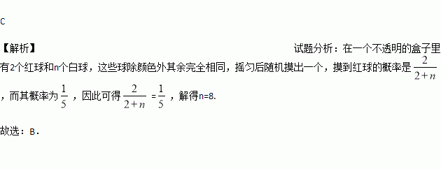 在一个不透明的盒子里有2个红球和n个白球,这些球除颜色外其余完全相同,摇匀后随机摸出一个,摸到红球的概率是,则n的值为( )