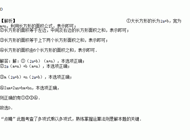 ①(2a+b)(m+n);②2a(m+n)+b(m+n);③m(2a+b)+n(2a+b);④2am+2an+bm+bn,你认为其中正确的有( )