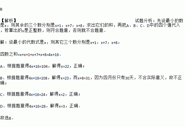 用一个正方形在四月份的日历上,圈出4个数,这四个数的和不可能是( )