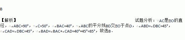 B 【解析】试题分析:∵AC是⊙O的直径,∴∠ABC=90°,∵∠C=50°,∴∠BAC=40°,∵∠ABC的平分线BD交⊙O于点D,∴∠ABD=∠DBC=45°,∴∠CAD=∠DBC=45°,∴∠BAD=∠BAC+∠CAD=40°+45°=85°,故选B.