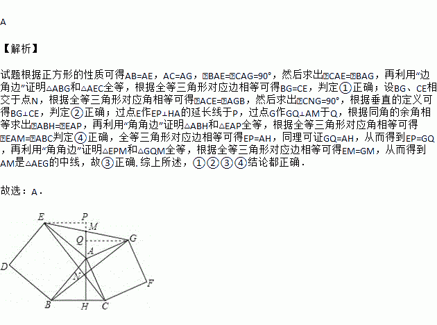 在锐角三角形ABC中,AH是BC边上的高,分别以AB,AC为一边,向外作正方形ABDE和ACFG,连接CE,BG和EG,EG与HA的延长线交于点M,下列结论:①BG=CE;②BG⊥CE;③AM是△AEG的中线;④∠EAM=∠ABC,其中正确结论的个数是( )