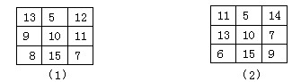 在图(1),(2)的空格中填入不大于15且互不相同的数(其中已填好一个数),使每一横行、每一竖列和对角线上的3个数之和都等于30.