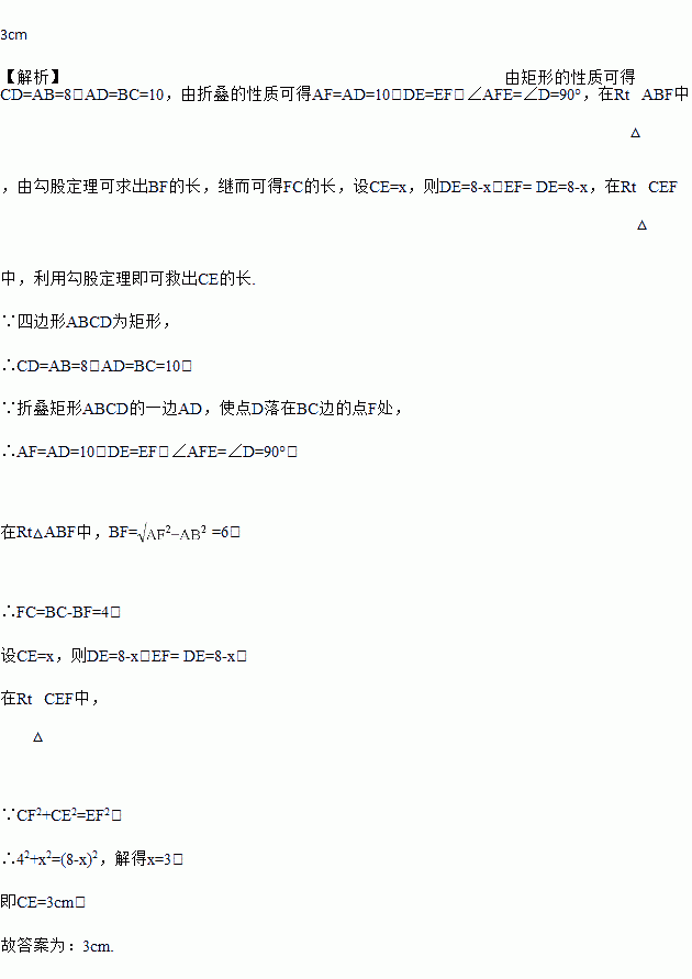 如图,折叠矩形纸片的一边AD,使点D落在BC边上的点F处,BC=10cm, AB=8cm, 则EC的长为_________.