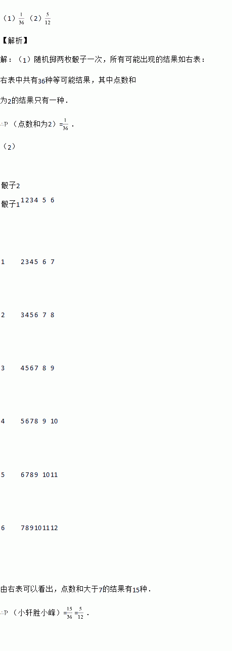 (2)小峰先随机掷两枚骰子一次,点数和是7,求小轩随机掷两枚骰子一次,胜小峰的概率.