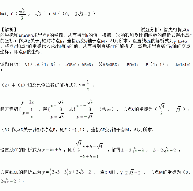 相交于点C,过直线上点A(1,3)作AB⊥x轴于点B,交反比例函数图象于点D,且AB=3BD.