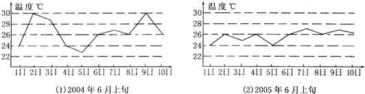 解答:从两幅图中可以看出:2004年6月上旬折线起伏较大,所以2004年6月上旬气温比较不稳定,则2005年6月上旬折线较平稳,则2005年6月上旬气温比较稳定.