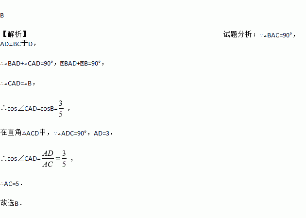 如图,在△ABC中,∠BAC=90°,AD⊥BC于D,AD=3,cosB=,则AC等于( )