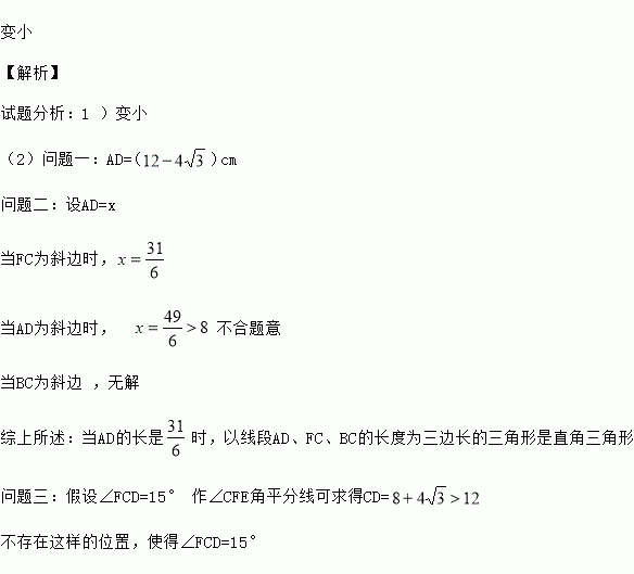 问题①:当△DEF移动至什么位置,即AD的长为多少时,F、C的连线与AB平行?