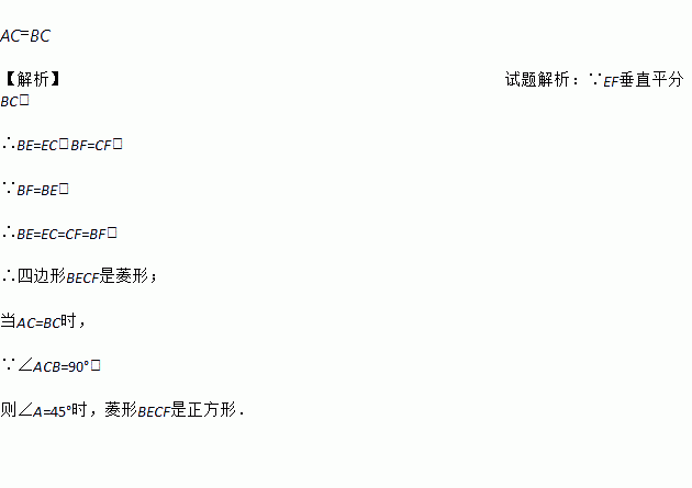 如图在△ABC中,∠ACB=90°,BC的垂直平分线EF交BC于点D,交AB于点E,且BE=BF,请你添加一个条件_________________,使四边形BECF是正方形.