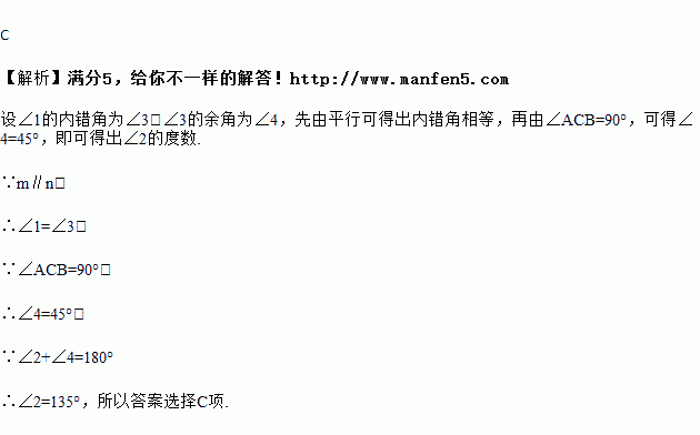 如图,直线m∥n,∠ACB的顶点C在直线m上,若∠ACB=90°,∠1=45°,则∠2的度数为( )