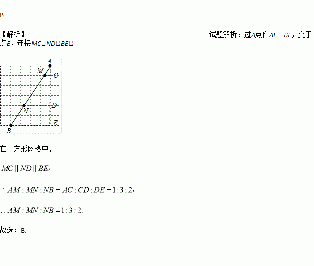 如图,在6×6的正方形网格中,连接两格点A,B,线段AB与网格线的交点为M,N,则AM∶MN∶NB为( )