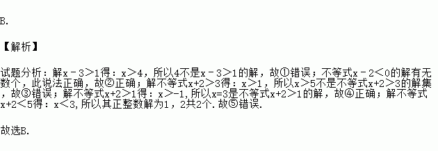 ①4是x﹣3>1的解;②不等式x﹣2<0的解有无数个;③x>5是不等式x+2>3的解集;④x=3是不等式x+2>1的解;⑤不等式x+2<5有无数个正整数解.