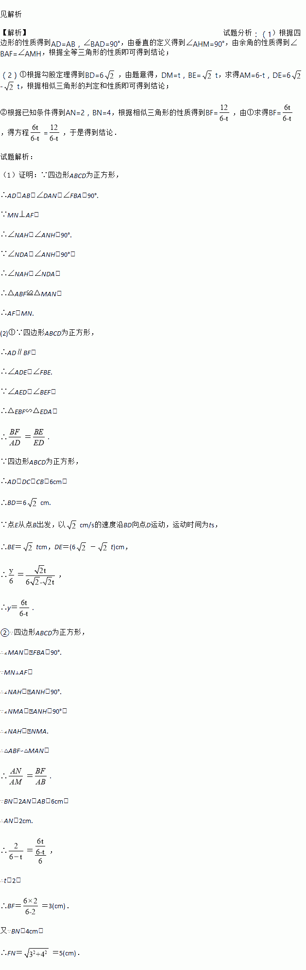 正方形ABCD的边长为6cm,点E,M分别是线段BD,AD上的动点,连接AE并延长,交边BC于F,过M作MN⊥AF,垂足为H,交边AB于点N.